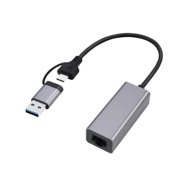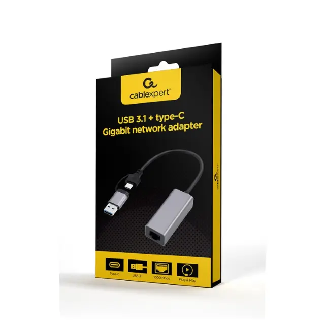 Cablexpert USB 3.1 Gigabit omrežni adapter. Praktičen kombiniran priključek USB Type-A + Type-C. Podpira 10/100/1000 Mbps Gigabitno LAN omrežje.