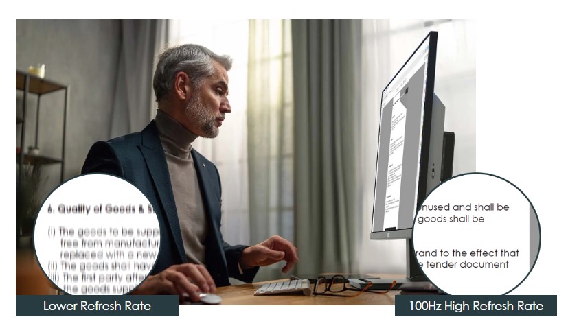 Udeležite se najbolj gladkega spletnega konferenčnega klica in strankam prikažite popoln oglaševalski videoposnetek s frekvenco osveževanja 100 Hz. Raziskave združenja VESA kažejo, da je za 95 % uporabnikov frekvenca osveževanja 85 Hz postala defacto standard za običajno uporabo, ki prikazuje slike "brez utripanja".