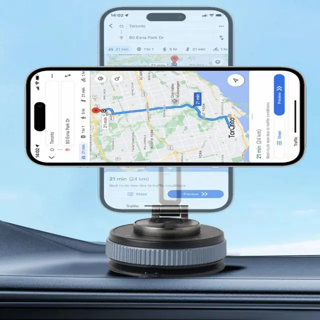 Vsestranska sesalna osnova: Sesalna osnova našega držala za telefon zagotavlja izjemno oprijemljivost na različnih površinah, vključno z armaturnimi ploščami in vetrobranskimi stekli. Inovativna lepilna sesalna skodelica zagotavlja močan in zanesljiv oprijem, tudi na teksturiranih ali neravnih površinah. Ta vsestranska osnova vam omogoča, da držalo postavite na najbolj priročno mesto v vašem vozilu, kar zagotavlja optimalno vidljivost in dostopnost. Sesalna skodelica je enostavno odstranljiva in ponovno uporabna, ne pušča pa nobenih ostankov.