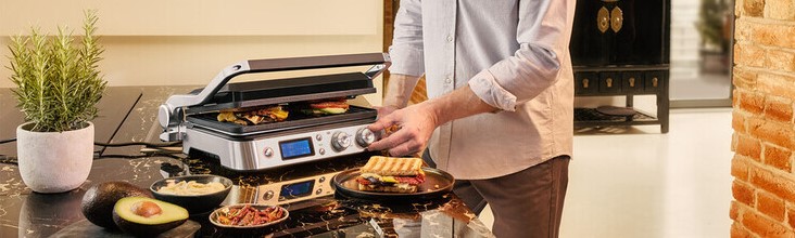 Raziščite neskončne možnosti priprave obrokov s tremi prilagodljivimi položaji za kuhanje. Tradicionalni kontaktni položaj nežno stisne hrano med ploščami, kar je idealno za sočne burgerje in zlato rjavo popečene sendviče. Odprt položaj za način delovanja BBQ, lahko istočasno peče zrezke na eni strani in zelenjavo na drugi. Položaj pečice je popoln za hrano, kot so ribe, bruskete ali rezine pice.