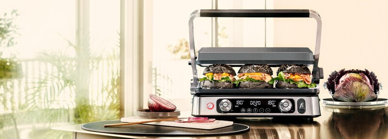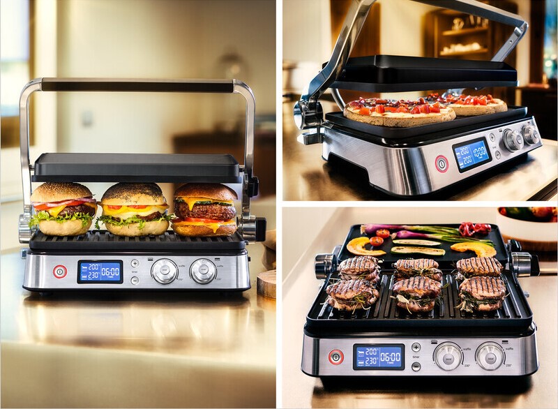 Bodite kreativni v kuhinji s tremi prilagodljivimi položaji za pripravo jedi. Tradicionalni kontaktni položaj nežno stisne hrano med ploščami, kar je idealno za sočne burgerje in zlato rjavo popečene sendviče. Napravo preklopite v odprto pozicijo za peko na žaru, pri čemer istočasno pečete zrezke na eni strani in pečete zelenjavo na drugi strani. Raziščite še večjo vsestranskost s položajem pečice, popolnim za peko občutljivih jedi, kot so ribe, bruskete ali rezine pice.