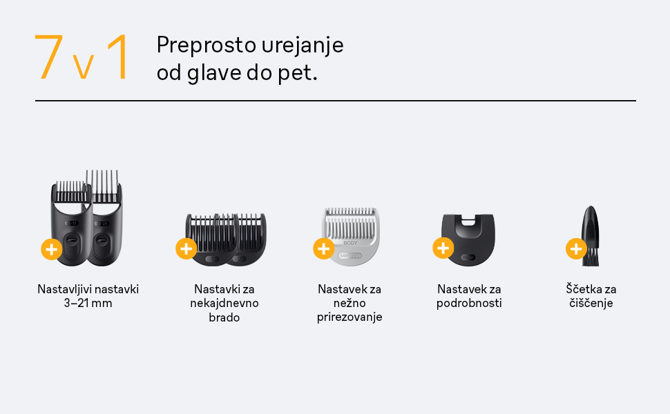 Neomejeno urejanje od glave do pet: Braunov vsestranski komplet za urejanje 7 v 1 vključuje izbrane pripomočke za prirezovanje brade, striženje las in urejanje dlak po telesu