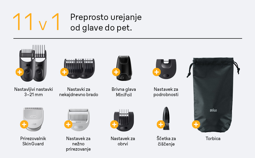 Neomejeno urejanje od glave do pet: Braunov vsestranski komplet za urejanje 11 v 1 vključuje izbrane pripomočke za prirezovanje brade, striženje las in urejanje dlak po telesu.