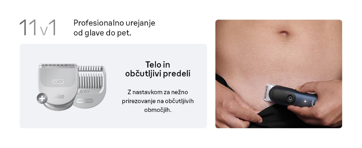 Profesionalno in povsem preprosto urejanje: Braunov komplet 11 v 1 za urejanje od glave do pet vključuje izbrane pripomočke za prirezovanje brade, ušesnih in nosnih dlak, striženje las in oblikovanje dlak po celem telesu