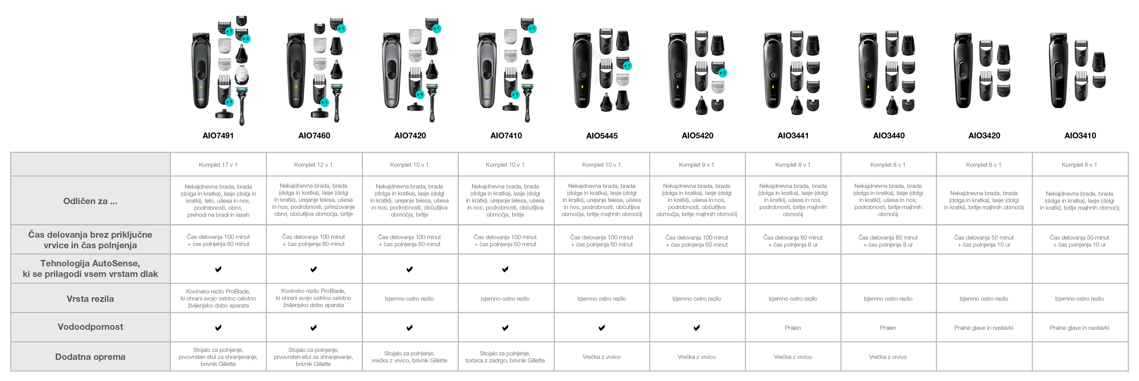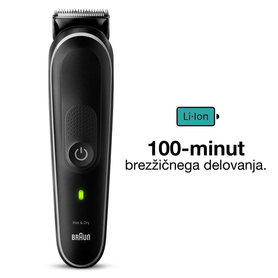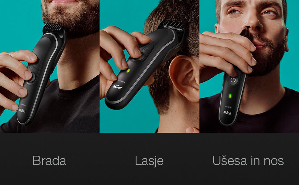 Odlični rezultati pri vseh dolžinah dlak in las, s fiksnima nastavkoma dolžine 1 mm in 3 mm ter drsnima nastavkoma za brado in lase (3–21 mm).