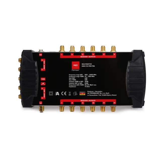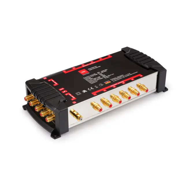 Multiswitch je namenjen razširitvi notranje antenske instalacije DVB-S2 in prizemnega satelitskega TV sistema DVB-T2. Naprava vam omogoča sprejem programov z enega satelita in povezavo do 12 satelitskih sprejemnikov. Pozlačene vtičnice bistveno zmanjšajo izgubo signala na priključku antenskega kabla in pomanjkanje oksidacije. Multi stikalo samodejno prepozna vrsto signala, ki se bo prenašal na sprejemnike. Multiswitch se napaja prek zunanjega napajalnika, zaradi česar je odpravljen pojav povišane delovne temperature, ki je pogost vzrok poškodb naprave.