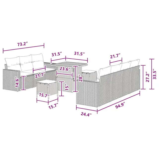vidaXL Vrtna sedežna garnitura z blazino 10 pcs Črna 80 x 80 x 71 cm