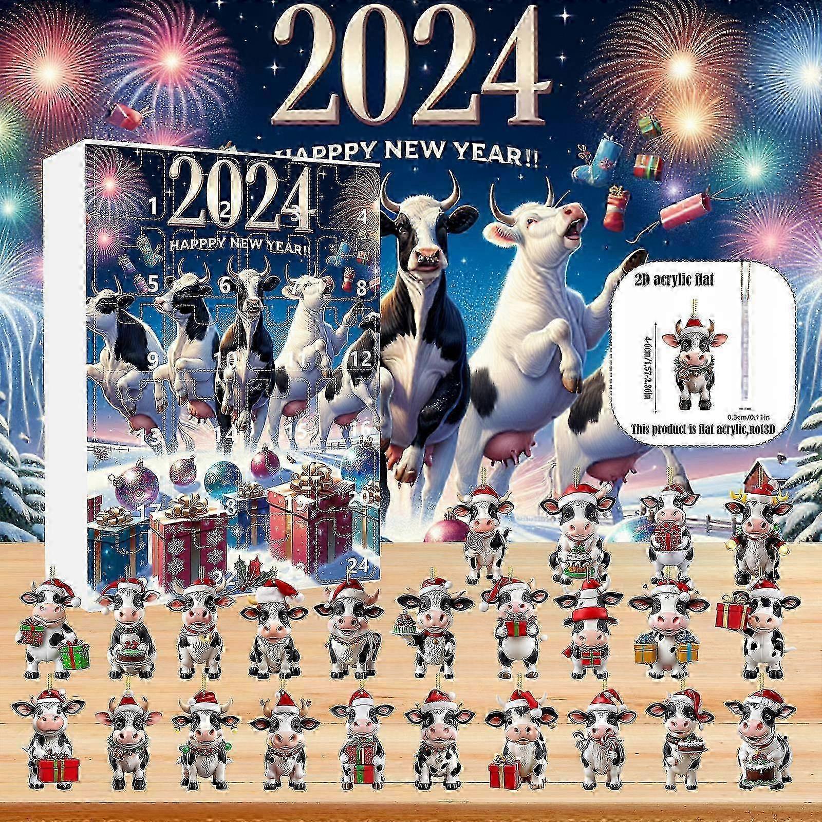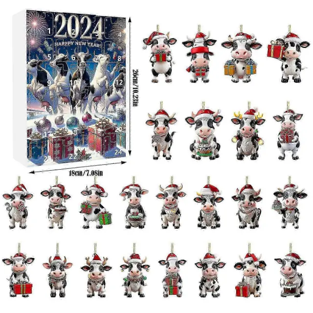 24-dnevni adventni koledar na temo krave 2024, božično odštevanje z visečimi okraski za otroško praznično dekoracijo