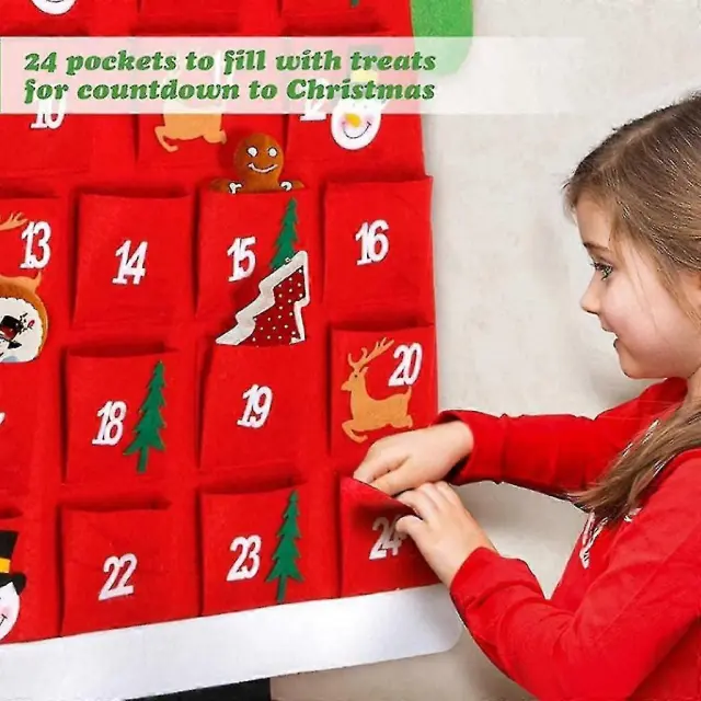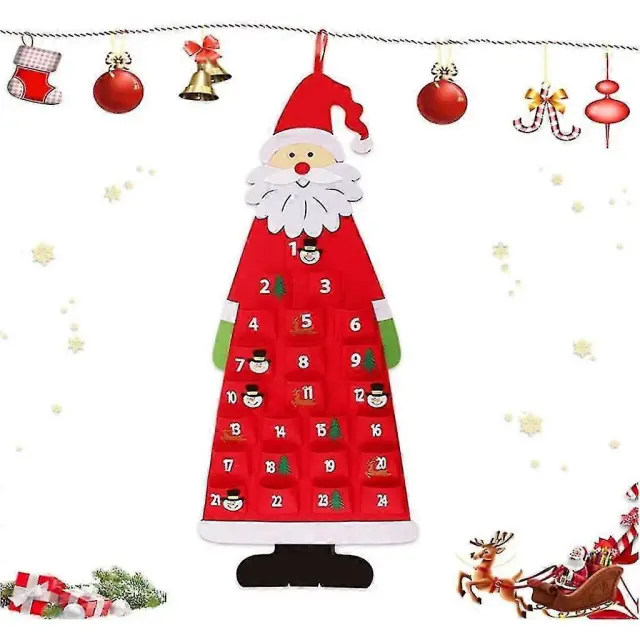 Božični adventni koledar iz filca, stenski viseči Božičkov koledar z žepi za 24 dni za božično odštevanje (rdeč)