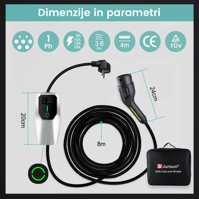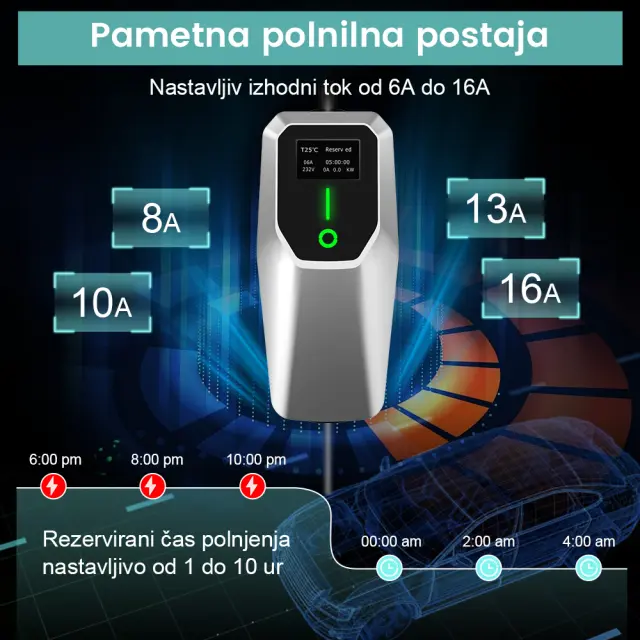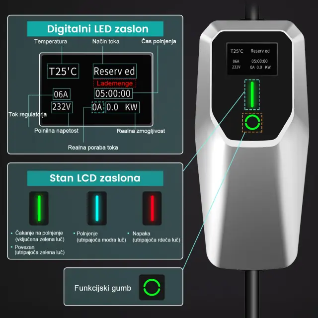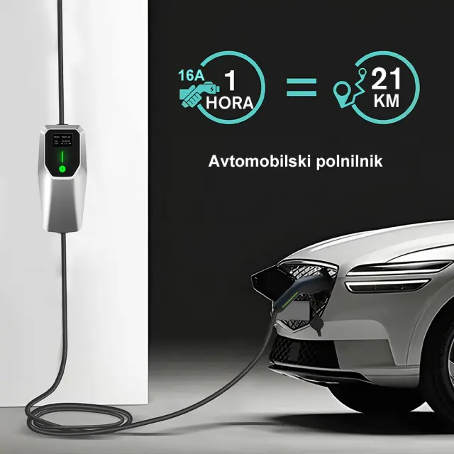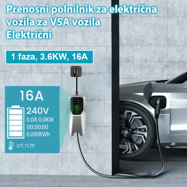 Tip 2 EV električni avtomobilski polnilni kabel – enofazni 3,68 kW, nastavljiv tok, LCD zaslon, prenosni polnilnik 8 m z vtičem Schuko (6--16A), I