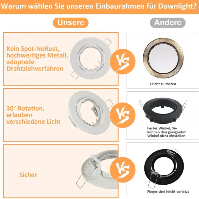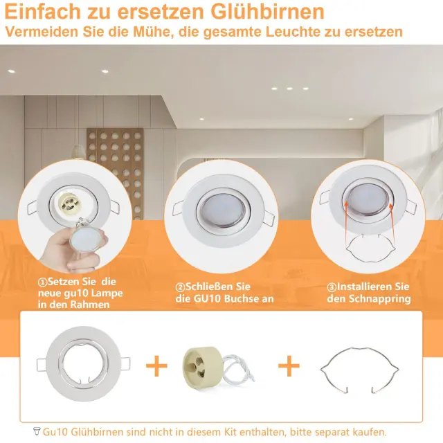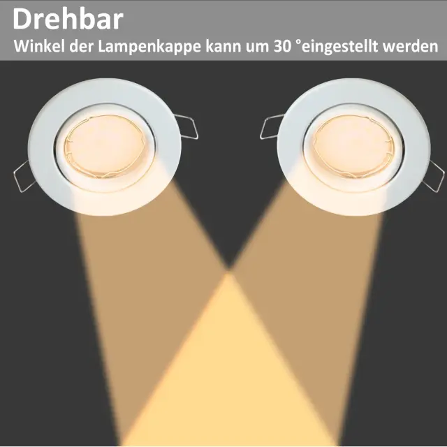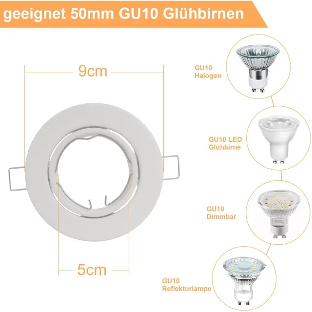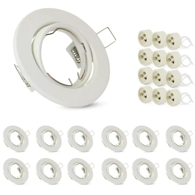 Tehnični podatki: Prejeli boste 12 belih montažnih okvirjev z 12 keramičnimi okovi GU10 in fiksnimi vzmetmi. (Žarnica ni priložena). Priporočamo premer vgradne luknje približno 68–80 mm in globino vgradnje približno 75–90 mm. Ta vgradni reflektor je združljiv s katero koli svetilko s premerom 50 mm, ne glede na to, ali gre za LED ali halogensko svetilko. Varstvo okolja in prihranek stroškov: S temi vgradnimi reflektorji vam ni treba uporabiti celotnega reflektorja. To žarnico GU10 je mogoče enostavno zamenjati, kar prihrani čas in denar. Okvir ščiti svetilko pred prahom, vlago in drugimi nečistočami, kar podaljša življenjsko dobo svetilke in s tem prispeva k varstvu okolja. Nastavljiv snop svetlobe: Te vgradne reflektorje je mogoče zasukati za 30°, kar omogoča prilagajanje kota svetlobe po potrebi. To omogoča individualno nastavitev osvetlitve in ustvarja svetlo in vabljivo vzdušje v prostoru. Preprosta in moderna zasnova stropnega reflektorja se dobro ujema z notranjim slogom in prostor naredi lepši in prostornejši. Varen in zanesljiv: Naš vgradni okvir svetilke je izdelan iz debele kovine in je obdelan proti rjavenju. Okvir je odporen proti koroziji, stabilen in trden. Vgradni reflektor ščiti svetilko pred stikom in preprečuje električni udar. Uporaba montažnih okvirjev izboljša tudi odvajanje toplote in podaljša življenjsko dobo svetilke. Zato je naš vgradni okvir za svetilko vaša varna in zanesljiva izbira. Te 230V LED-downlights so primerne za dnevne sobe, spalnice, kuhinje, kopalnice, hodnike, hotele, pisarne, knjižnice, KTV-je, kleti, veleblagovnice in številne druge prostore, ki potrebujejo svetle stropne luči. Naš vgradni okvir za reflektor ima 2-letno garancijo. Če imate kakršna koli vprašanja, nas prosim kontaktirajte.