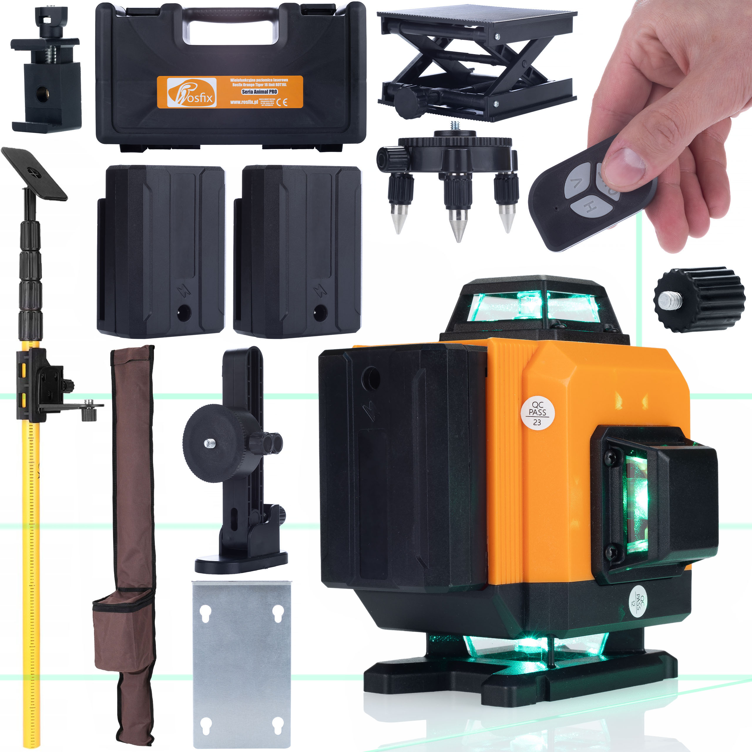 1️⃣ Rosfix Orange Tiger ROT16L križni laser: profesionalno orodje z visoko natančnostjo. Ta laser omogoča določanje naklonov, komplet pa vključuje številne dodatne elemente, med drugim trpežen stativ in praktično torbico.