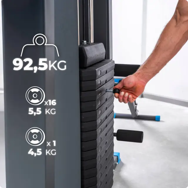 🔹 Stos uteži: 92,5 kg (16 × 5,5 kg + 1 × 4,5 kg).