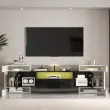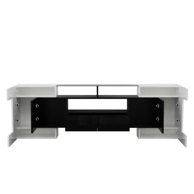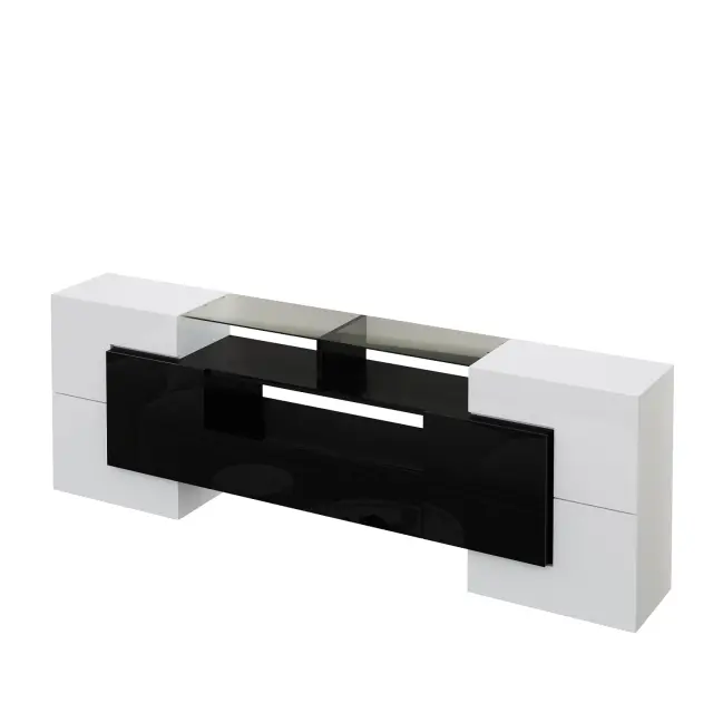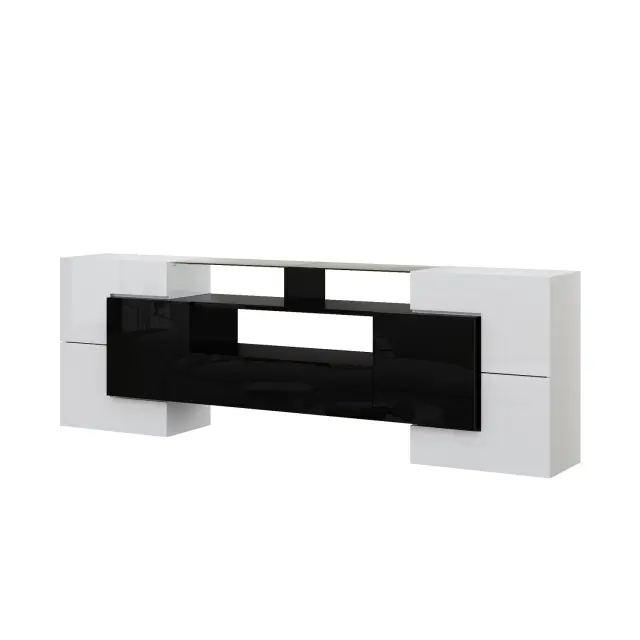 Elegantna TV omarica, 200 cm, visokosijajna bela/črna, LED, steklena površina.