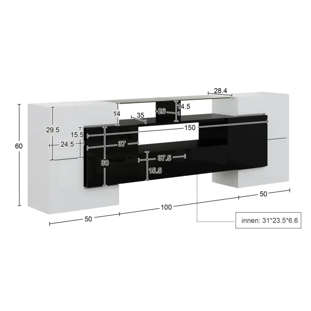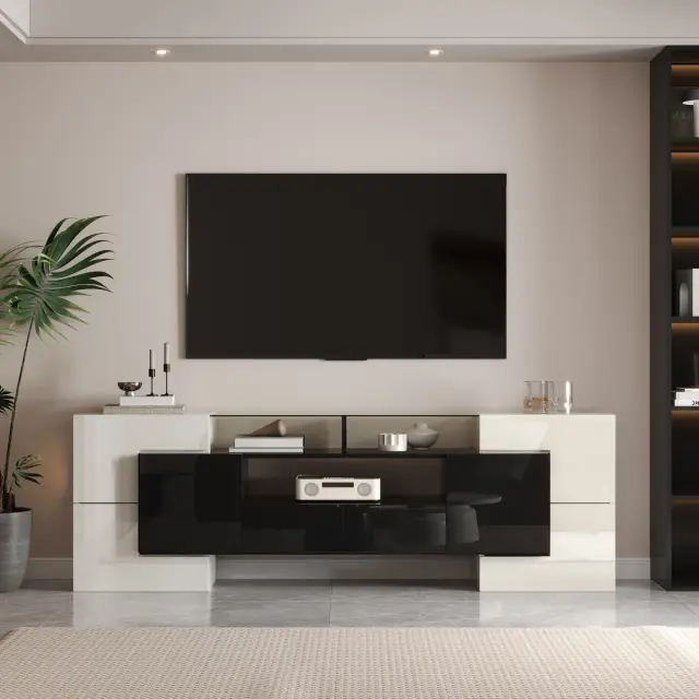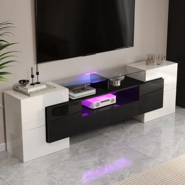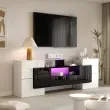Elegantna TV omarica s stekleno ploščo, LED osvetlitvijo in veliko prostora za shranjevanje. Moderna oblika, enostavna montaža. 200 x 35 x 60 cm. Črna/bela.
