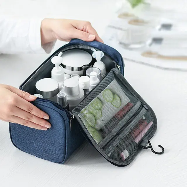 Priročen kavelj za obešanje: Trden vgrajen kavelj vam omogoča, da torbo za toaletne potrebščine obesite na stojalo za brisače, glavo tuša ali kljuko na vratih, kar omogoča enostaven dostop do vaših toaletnih potrebščin. Ta funkcija je še posebej uporabna v majhnih kopalnicah z omejenim prostorom na pultu.