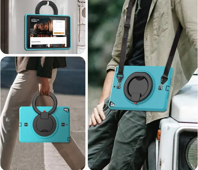 Ta visokokakovosten zaščitni ovitek je zasnovan za zagotavljanje visoke stopnje varnosti vaše naprave med vsakodnevno uporabo. Sestavljen je iz treh plasti, ki vključujejo trdno plastično ohišje in mehko silikonsko hrbtišče za učinkovito ublažitev udarcev in tresljajev. Izdelek je opremljen z vgrajenim stojalom in naramnim trakom, kar omogoča prilagodljivo uporabo v različnih okoljih, od pisarniških prostorov do aktivnosti na prostem. Natančna izdelava zagotavlja, da so vsi gumbi in vrata naprave popolnoma dostopni, medtem ko turkizna barva doda napravi sodoben videz.