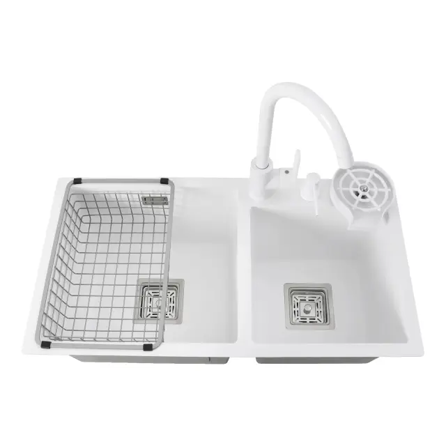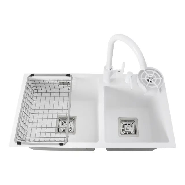 • Brezskrbna uporaba: Opremljen s 360° rotirajočo pipo za toplo in hladno vodo, ta umivalnik omogoča priročno pomivanje v obeh koritih, kar zagotavlja hitro in učinkovito čiščenje.