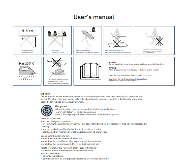 Stabilna in praktična likalna deska, zasnovana za udobno in enostavno vsakodnevno uporabo. Nastavitev višine je zelo preprosta, kar omogoča hitro prilagoditev najbolj udobnemu delovnemu položaju za vsakega uporabnika. Za varno shranjevanje jo je mogoče zakleniti v zložen položaj, kar preprečuje nenamerno odpiranje. Vključuje velik in robusten odlagalnik za likalnik ter domiselno vodilo za kabel, ki drži kabel stran od delovne površine in omogoča bolj tekoče likanje brez prekinitev. Vse združljive prevleke so certificirane po OEKO‑TEX® STANDARD 100, kar zagotavlja varne in visokokakovostne materiale. Deska je združljiva s prevlekami Mary, Holly, Peggy metalizirano z motivi in Drop Stop, kar ponuja več slogovnih in funkcionalnih možnosti glede na želje uporabnika.