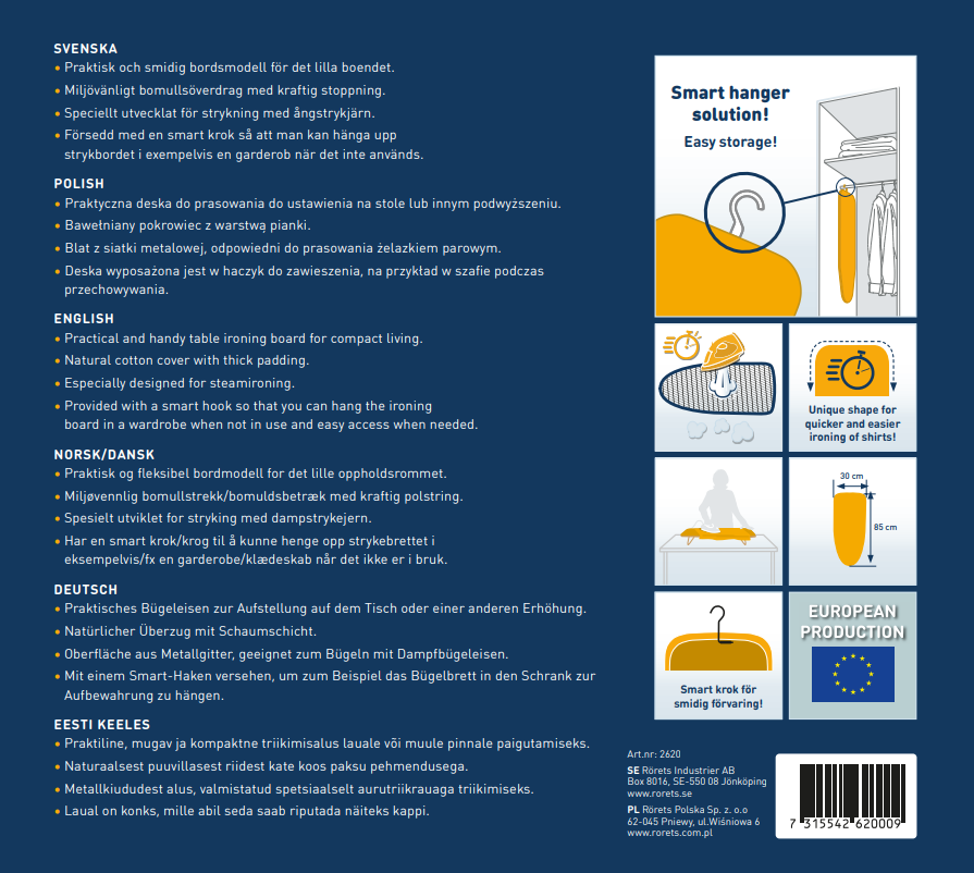 Praktična namizna likalna deska, popolna za vse, ki imajo malo prostora ali potrebujejo kompaktno in enostavno rešitev. Zelo preprosto se razpre in zloži, kar omogoča hitro uporabo in shranjevanje brez zavzemanja prostora.