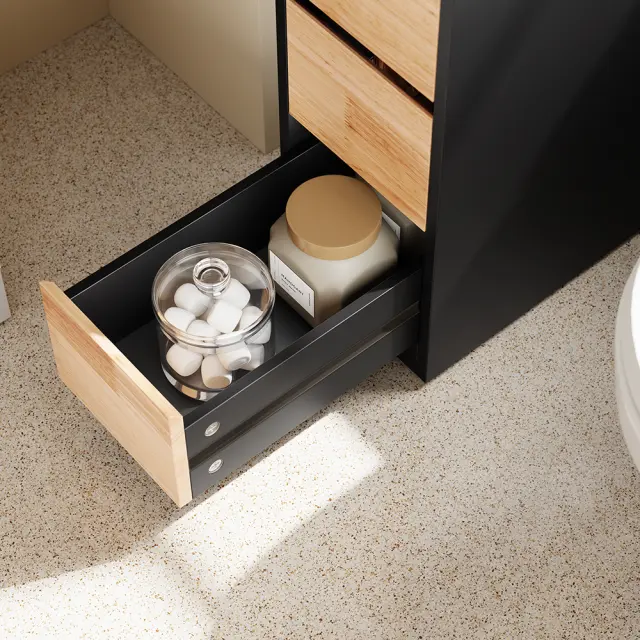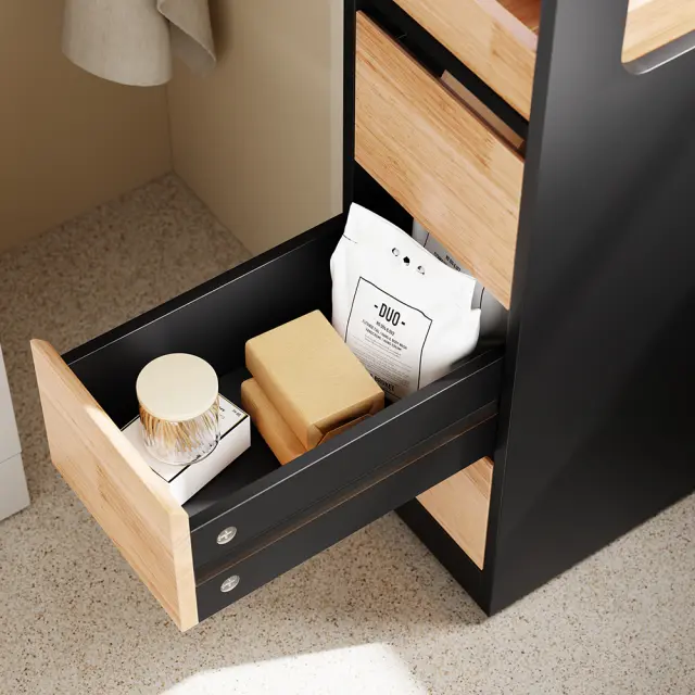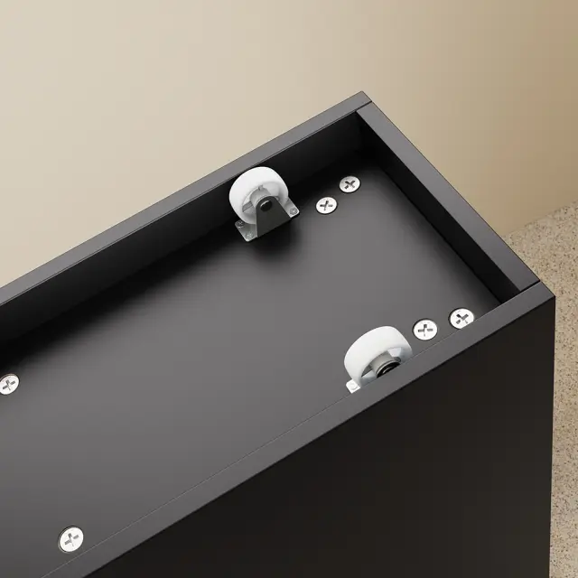 Funkcionalnost dopolnjujejo širši okvir in skrita kolesca, ki ohranjata estetski videz. Višina zgornje police je optimizirana za lahek dostop do pogosto uporabljenih predmetov.