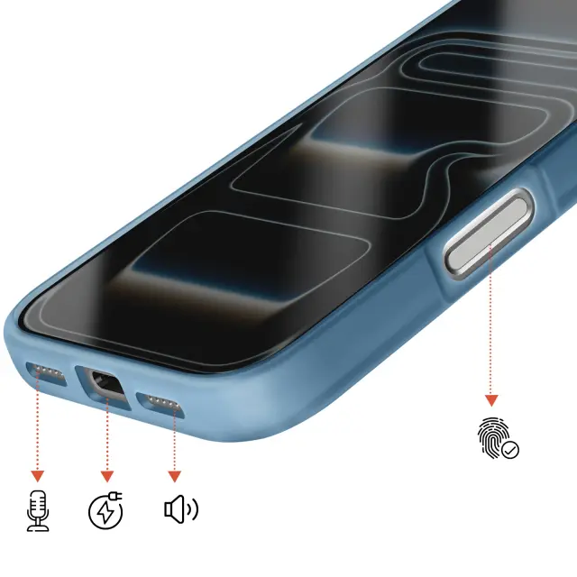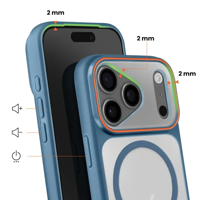 Vgrajen magnetni sistem za stabilno pritrditev polnilnikov in dodatne opreme MagSafe brez odstranjevanja ohišja. Trdna polikarbonatna hrbtna stran v kombinaciji s poltrdnim silikonskim okvirjem za učinkovito zaščito pred udarci. Za 2 mm povišan sprednji rob in dodatna debelina okoli enote kamere za zmanjšanje nevarnosti prask in udarcev. Elegantna mat obdelava zmanjšuje količino prstnih odtisov, hkrati pa ohranja diskretno, sodobno obliko.