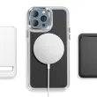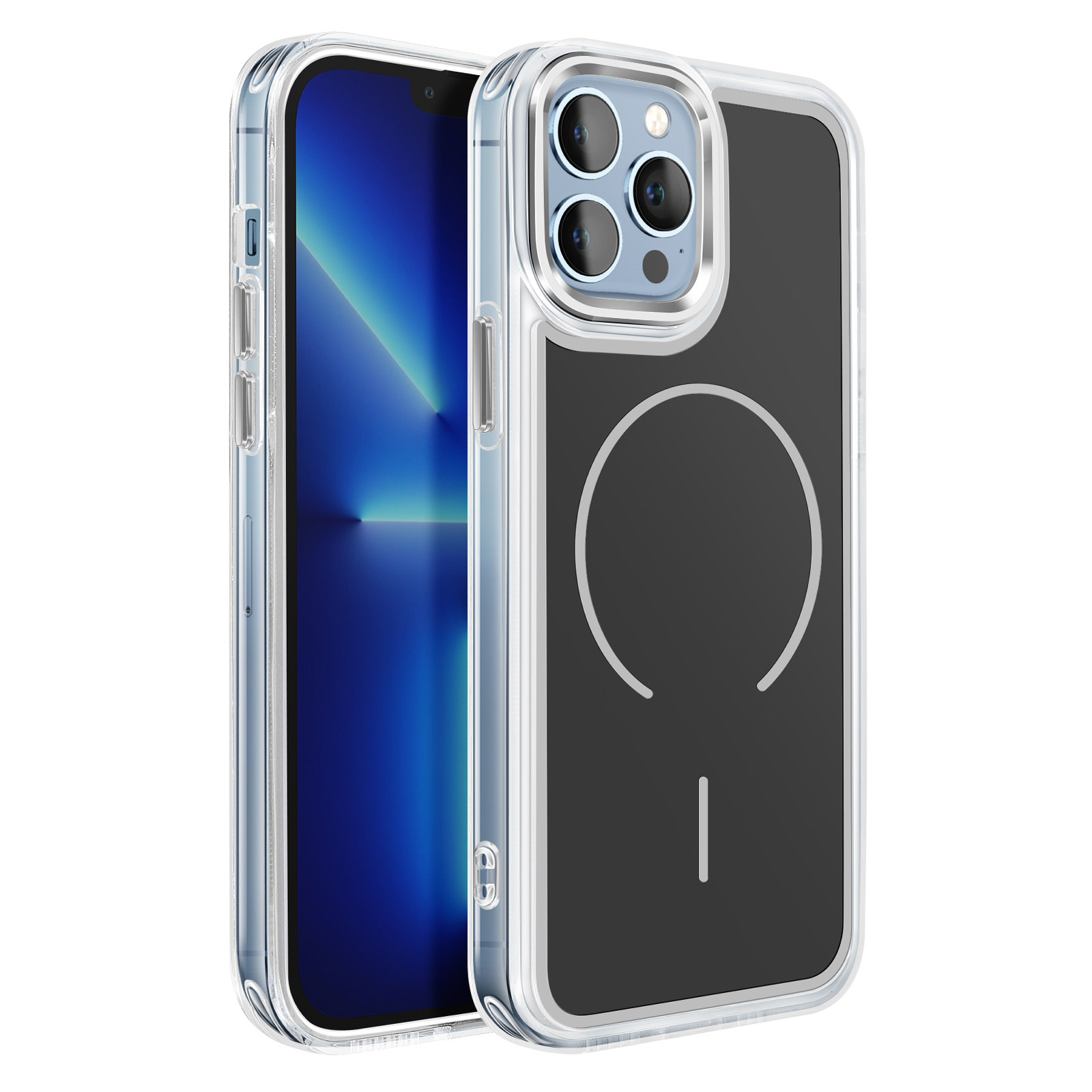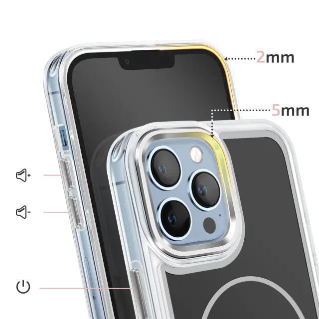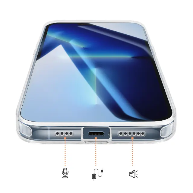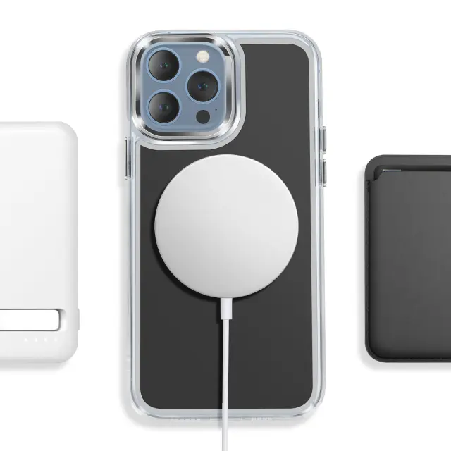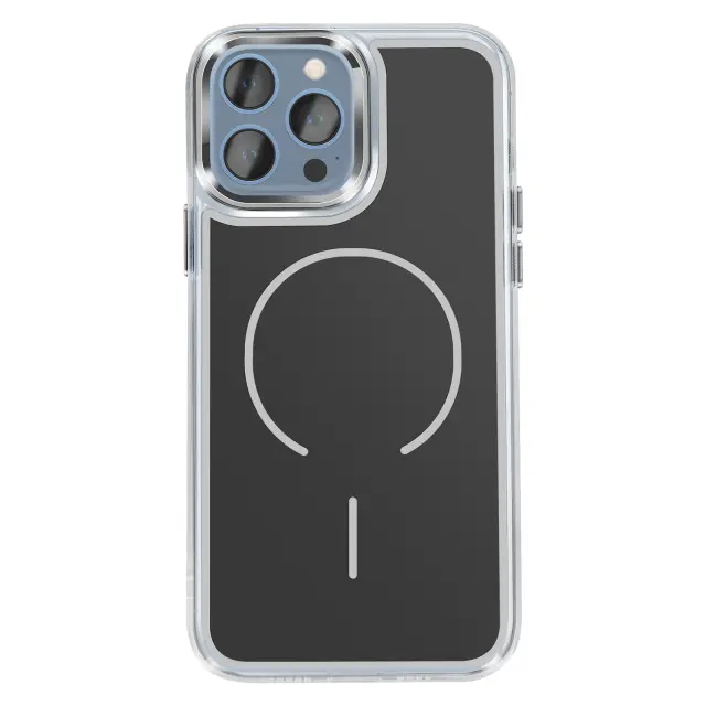 Vgrajen magnetni obroč za natančno poravnavo za brezžično polnjenje in uporabo magnetnih pripomočkov, združljivih s sistemom MagSafe. Kombinacija matirane trde hrbtne strani, ki preprečuje praske, in prozorne, ojačane mehke oblike za dobro ravnovesje med slogom in vsakodnevno zaščito.. Ojačani vogali z notranjimi zračnimi blazinami, ki blažijo udarce pri vsakodnevnem rokovanju in padcih.. Rahlo dvignjen, metaliziran okvir kamere, ki pomaga zmanjšati praske na površinah.