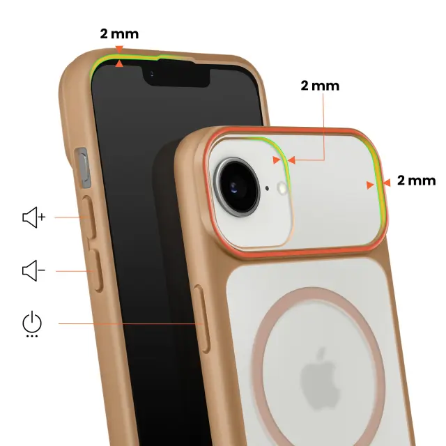 Vgrajen magnetni obroč za natančno poravnavo z združljivimi polnilniki in dodatki MagSafe za brezžično polnjenje. Trden hrbet iz prosojnega polikarbonata v kombinaciji s poltrdim okvirjem za dobro ravnovesje med podporo in vsakodnevno zaščito. Diskretna oblikovana prevleka pomaga zmanjšati praske in neposreden stik s fotografskimi senzorji.. Sprednji rob je dvignjen za približno 2 mm, da se zmanjša nevarnost neposrednega stika zaslona z ravno površino..