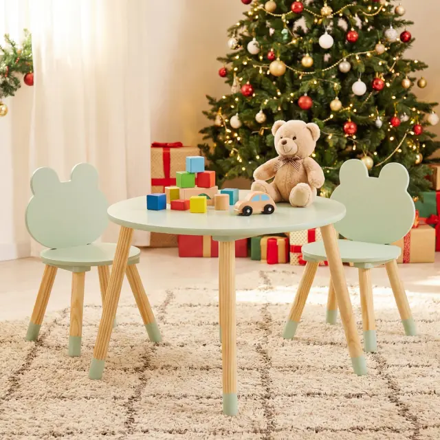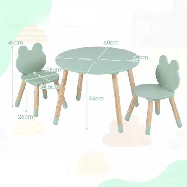 Prikupen komplet stolov in mize: ta otroški jedilni set vsebuje 1 mizo in 2 stola. Vsak stol ima prikupno in udobno naslonjalo, ki združuje udobje in igriv čar - vabljiv prostor za otroke.