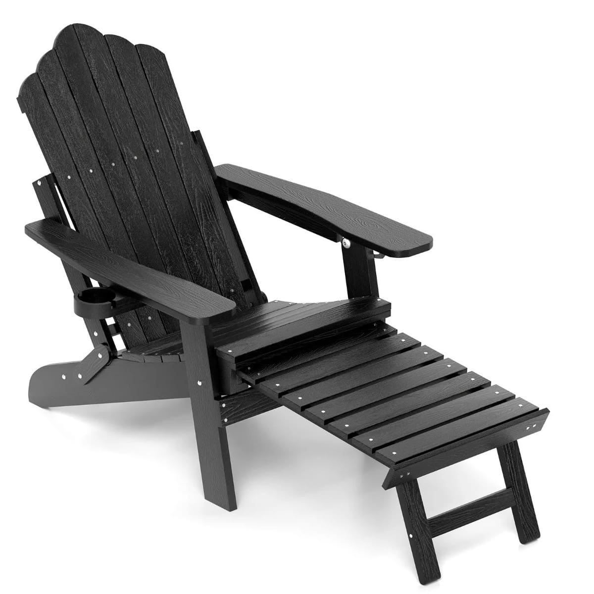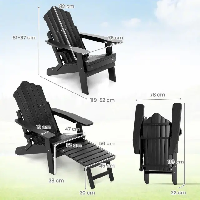 S 4-stopenjsko nastavljivim naslonjalom lahko v tem počivalniku udobno berete, se sončite in dremate. Stol Adirondack je izdelan iz visokokakovostnega materiala HIPS, ki je odporen na vremenske vplive, in ojačan z vijaki iz nerjavečega jekla. Odporen je na vse vremenske razmere ter zagotavlja vzdržljivost in nezahtevno vzdrževanje. Prijeten sedež ima vrtljivo držalo za skodelico za pijačo ali pripomočke, kar povečuje njegovo uporabnost. S hitro zložljivo zasnovo in zložljivim naslonom za noge je prevelik stol prostorsko varčen ter enostaven za shranjevanje in prenašanje. Nadgradite svoj vrt ali teraso s tem elegantnim in funkcionalnim kosom, ki je popolna kombinacija udobja in priročnosti za vsak dom.