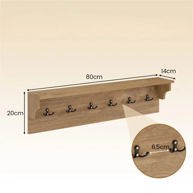 Ta stenski obešalnik ima leseno polico in 6 elegantnih kavljev, ki so idealni za urejeno shranjevanje klobukov, brisač, torb in kopalnih plaščev. Odprta zasnova shranjevanja omogoča enostaven dostop do predmetov in jih ohranja lepo vidne.