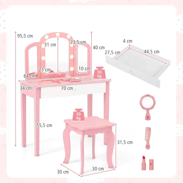 Ta simpatična toaletna mizica ima trikotno ogledalo z na dotik upravljanimi lučkami LED v treh barvah, tako da lahko malčki prilagodijo svetlobo po svojih željah in se občudujejo s katerega koli zornega kota. Priložene so 3 prikupne lesene igrače za ličenje, prostoren predal in velik prostor na mizi pa poskrbita za urejenost igrač in pripomočkov. Ogledalo je mogoče v nekaj sekundah odstraniti.