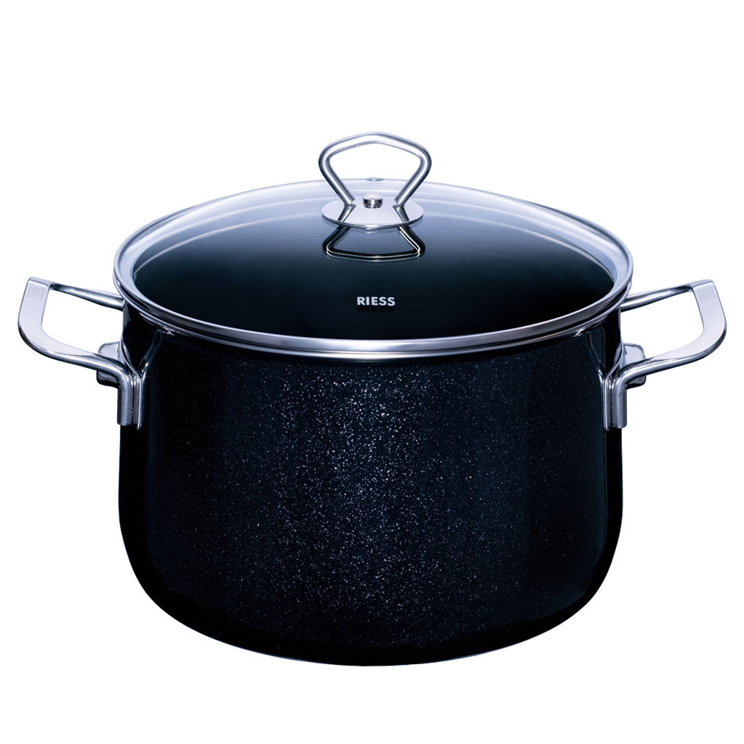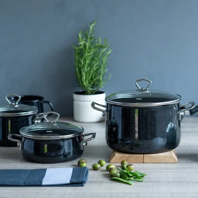 Lonec premera 24 cm, je del linije Nouvelle Black Magic, ki navdušuje s svojim modernim dizajnom in vznemirljivo mešanico materialov. Posoda s steklenim pokrovom ima priročno oblikovan ročaj iz nerjavečega jekla v modernem dizajnu in omogoča stalen vpogled v vsebino. Izdelana je iz emajla - materiala iz železa, ki je bil pri visokih temperaturah spojen s steklom. Emajliran lonec lahko uporabljate na vseh vrstah štedilnikov (plinskih, električnih, steklokeramičnih, indukcijskih in tudi na odprtem ognju). Zahvaljujoč dobri toplotni prevodnosti emajla so tudi stene posode vsepovsod tople, kar prihrani energijo. Robusten kromiran rob preprečuje krušenje. Neporozna, gladka steklena površina zagotavlja popolno higieno, je nevtralna glede arome in zavira razvoj bakterije ter je enostavna za čiščenje, saj jo lahko pomijete v pomivalnem stroju. Ob pravilni uporabi in negi bo emajlirana posoda dolgo zdržala in ohranila tipičen sijaj. Priporoča se tudi ljudem z alergijami na nikelj. NAMIG: Preverite še ostalo ponudbo posode iz linije Black Magic.