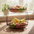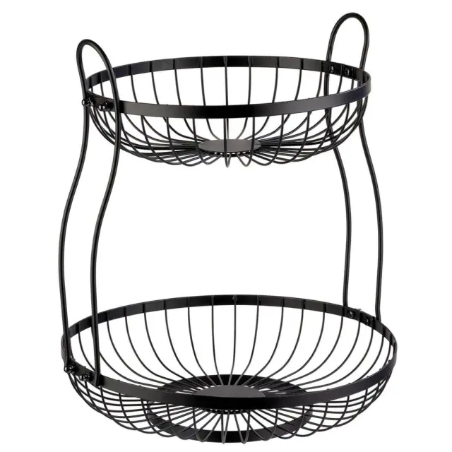 Elegantna dvonadstropna žična košara Doppio združuje funkcionalnost in sodoben dizajn. Je idealen dodatek za postrežbo kruha, sadja ali zelenjave na jedilni mizi ali bifeju. Izdelana je iz črne kovine z varnim premazom za stik z živili, kar zagotavlja dolgo življenjsko dobo in enostavno vzdrževanje. Dve etaži omogočata pregledno in prostorno shranjevanje, odprta zasnova pa skrbi za dobro kroženje zraka. Premer spodnje etaže je 30 cm, zgornje pa 25 cm. Priporočeno je ročno pomivanje.