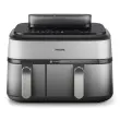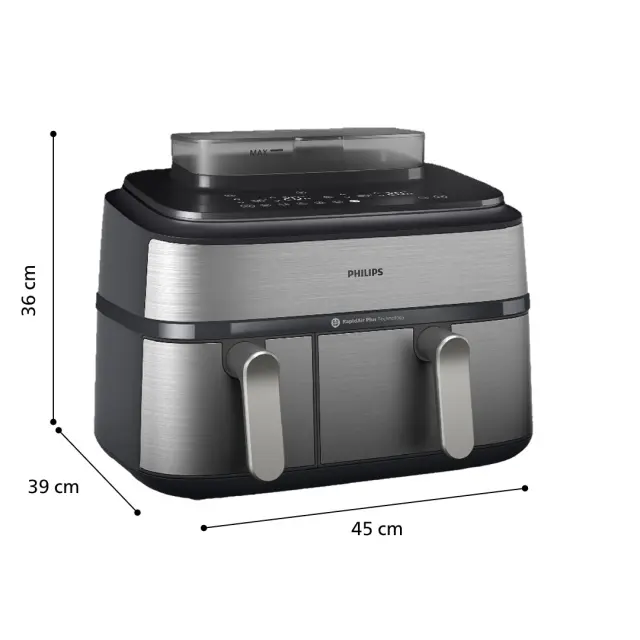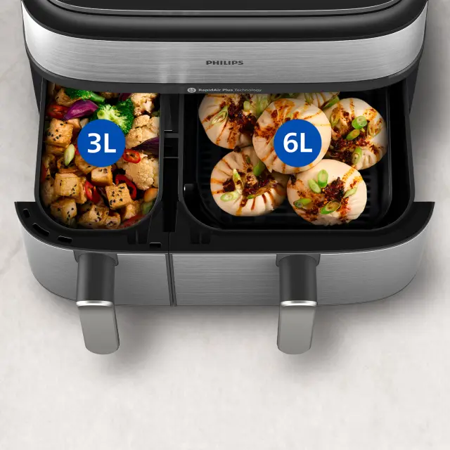 S 6-litrskim predalom za glavne jedi, kot so ocvrt krompirček ali meso, in 3-litrskim predalom za priloge omogoča skupno kapaciteto 9 litrov, kar je dovolj za pripravo večjih obrokov. Edinstvena funkcija sinhronizacije poskrbi, da so jedi iz obeh predalov pripravljene istočasno, kar zagotavlja popolno časovno usklajenost.