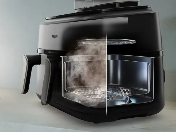 Philips Airfryer z dvojno košaro in funkcijo pare prinaša popolnoma nov način priprave obrokov, saj združuje tehnologijo cvrtja z vročim zrakom in paro. Omogoča pripravo dveh različnih jedi hkrati ter poskrbi, da hrana ostane hrustljava, hranljiva in okusna. Odslej bodo vaši obroki pripravljeni lažje, hitreje in bolj zdravo.