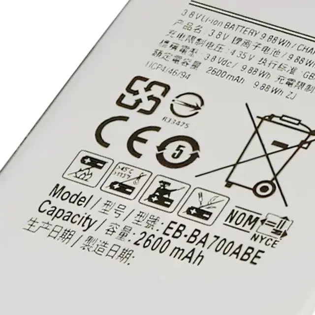 Li-polimerna baterija z zmogljivostjo 2600 mAh za dolgotrajno avtonomijo in stabilno polnjenje pametnega telefona. Združljiv s telefonom Samsung Galaxy A7, neposredno nadomešča številko dela EB-BA700ABE brez spreminjanja. Napetost 3,8 V in energija 9,9 kWh za zmogljivost, enakovredno originalni bateriji. Kompaktna in natančna zasnova za enostavno notranjo namestitev v telefon.