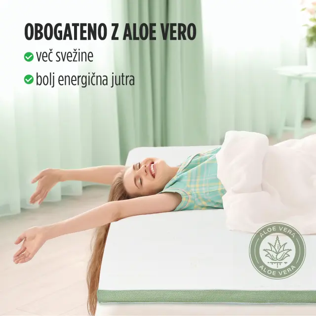 Nadvložek iz hladno stisnjene pene Aloe Vera II je visok 4 cm in daje dodatno udobje vašem ležišču, podaljšuje njegovo življenjsko dobo in zagotavlja, da se boste zjutraj zbudili spočiti in naspani, kot še nikoli doslej. Ortopedsko jedro iz visokoelastične poliuretanske pene s piramidno strukturo zagotavlja točkovno podporo in se telesu popolnoma prilagodi. Prevleka nadvložka je obogatena z esenco aloe vere, je snemljiva in pralna na 30 °C. Uživajte v tako mirnem spancu, kot bi spali na najbolj udobnem oblačku!