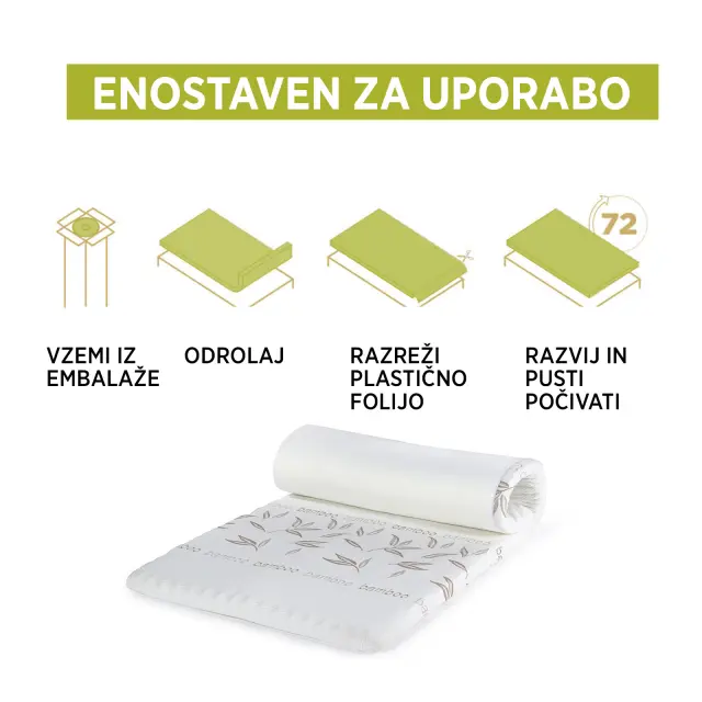 Izboljšaj svoje noči z udobnim nadvložkom. Bamboo Relax vsako ravno podlago spremeni v udobno ležišče: sedežno garnituro, dotrajano ležišče, uporabiš pa ga lahko tudi na dopustu, kampiranju ali kot pomožno ležišče.  Ortopedsko jedro točkovno sprošča tvoje mišice in poskrbi, da je tvoje telo vsako noč sproščeno. Prevleka je obogatena z bambusovimi vlakni. ki naravno pomagajo k uravnavanju temperature telesa med spanjem.