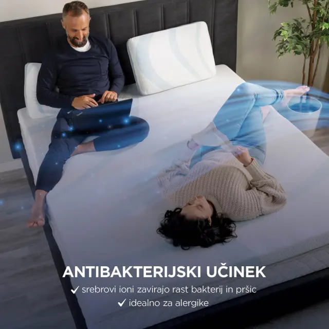 Spoznaj novo razkošje spanca s premium nadvložkom MemoSilver Premium Fresh 5+2. Edinstvena lastnost tega nadvložka je prevleka s hladilnim učinkom, ki odlično uravnava temperaturo za prijetno spalno okolje in noči brez potenja. Posebna spominska pena, ki je prepojena z gelom in ima dodano aktivno oglje, pomaga odvajati odvečno toploto ter preprečevati razvoj pršic in bakterij. V kombinaciji s srebrovimi ioni v prevleki je ta nadvložek odlična izbira za alergike, ljudi z občutljivo kožo in vse, ki bi se radi dobro naspali. Ta 7-centimetrski nadvložek z nedrsečo podlago in 4 elastičnimi trakovi se trdno oprime postelje, kavča ali tal, zato se nadvložek med spanjem ne premika.