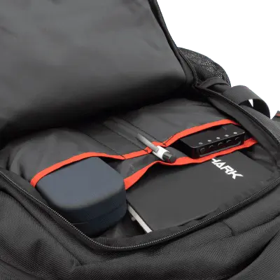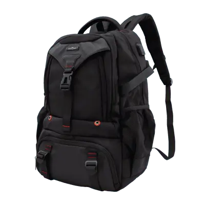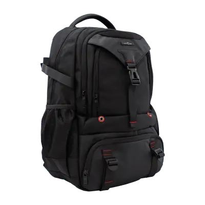 Za prenosnike do: 20.0'' Barva: Črna z rdečimi detajli Število predelkov: 1 x glavni predal, 1x predal na zadnji strani nahrbtnika, 3 x dodatni predelki na sprednji strani + stranski mrežasti žepi Material: HQ najlon + 210D poliester Vodoodporen material: D Mere (mm): 370x510x170 Ostalo: Podložen zadnji del torbe, oblazinjene naramnice za boljši pretok zraka, zaščitni prsni pas