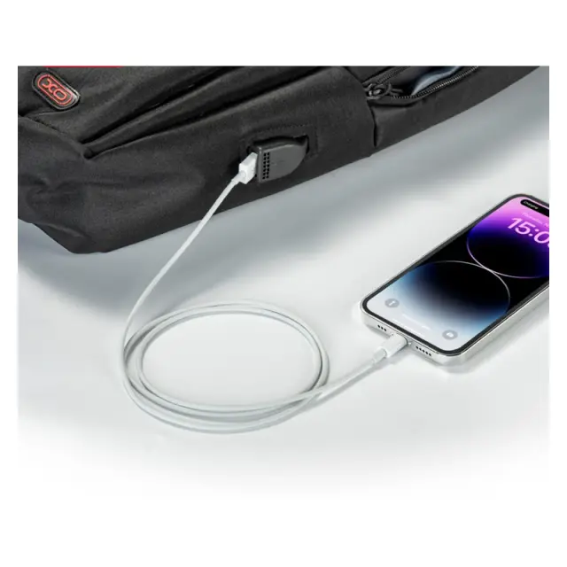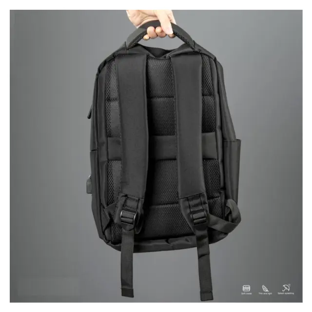 Nahrbtnik za prenosni računalnik z velikostjo zaslona 15,6". Izdelan iz nepremočljive tkanine, odporne na praske. Ima več predelkov, con in stranski USB priključek za hitro polnjenje.