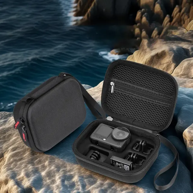 Zaščita pred udarci: Etui je zasnovan z vpojnim notranjim slojem za blaženje udarcev in notranjim oblazinjenjem, ki zmanjšuje sile ob padcih ali trkih. Zunanji najlonski ovoj dodatno ščiti pred površinskimi poškodbami, medtem ko notranja konstrukcija varuje kamero in nameščene nosilce med aktivnimi športi ali potovanji. Takšna kombinacija materialov je primerna za uporabnike, ki zahtevajo zanesljivo odpornost proti udarcem med transportom in uporabo na terenu.