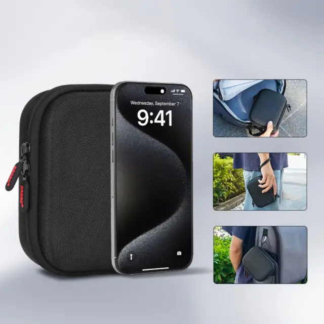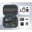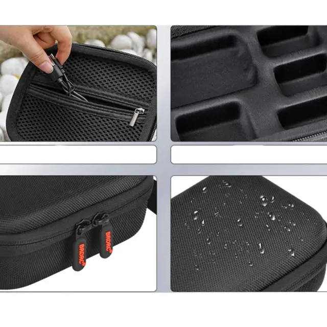 Kompaktna organizacija: Kompakten in lahek ročni etui omogoča enostavno prenašanje v žepu, nahrbtniku ali pritrjeno na pas z priloženim karabinerjem. Notranja razporeditev predelkov preprečuje mešanje in zapletanje kablov ter omogoča hiter dostop do kamere, nosilcev in polnilnih kablov. Zunanji najlon je obdelan za odpornost proti praskam, kar ohranja estetski videz in podaljšuje življenjsko dobo naprave med vsakodnevno uporabo in na terenu.