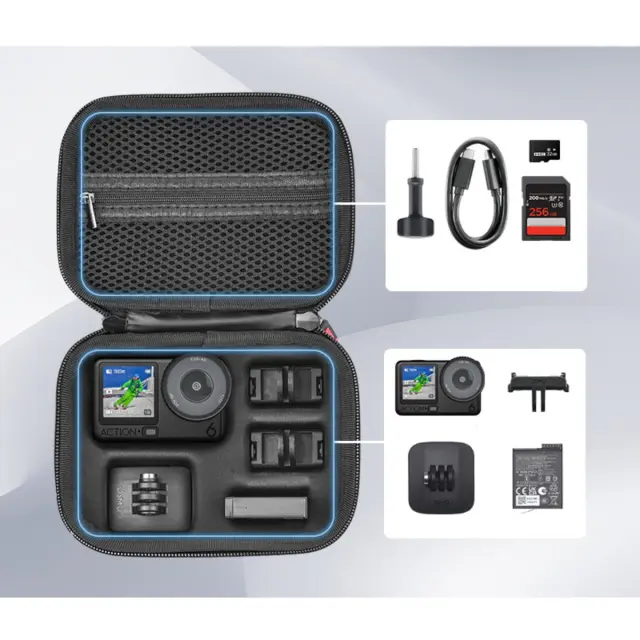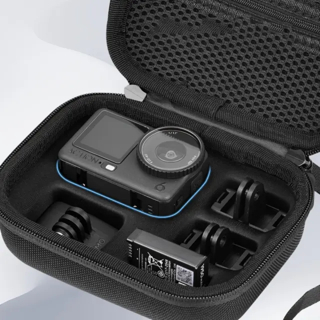 Natančno prileganje: Ta najlonski etui je natančno oblikovan po meritvah dejanske naprave DJI Osmo Action 6, da zagotavlja popolno prileganje. Notranjost iz najlona varno objame kamero in omeji premikanje med transportom, kar ohranja stabilnost opreme. Prilagojeni predelki omogočajo urejeno shranjevanje nosilcev, kablov in majhnih dodatkov, kar pospeši pripravo za snemanje na terenu ali pri hitrih izmenah opreme med potovanji.