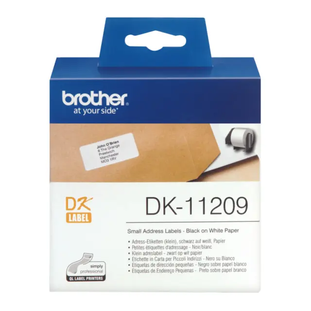 Te pristne nalepke Brother DK-11209 so priročne za širok spekter vaših splošnih potreb po označevanju. Za uporabo v domu in v pisarniškem okolju se lahko te predrezane nalepke z majhnimi naslovi uporabijo za prikaz logotipov, črtnih kod, značk za obiskovalce ali informacij o pošiljanju.