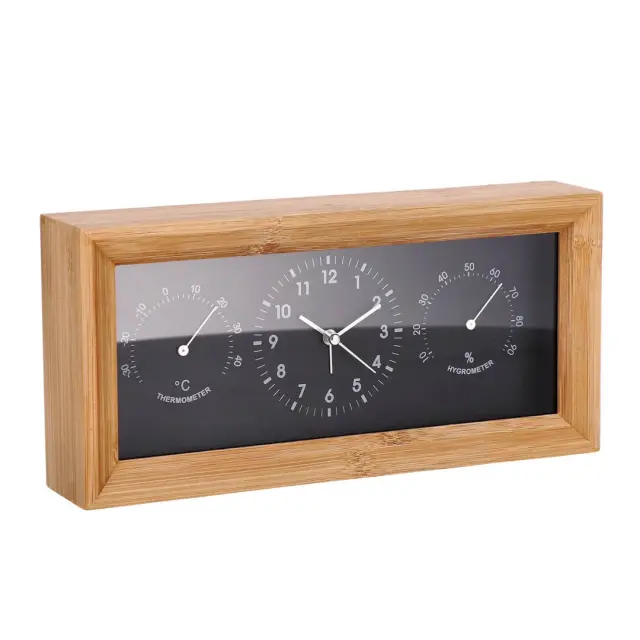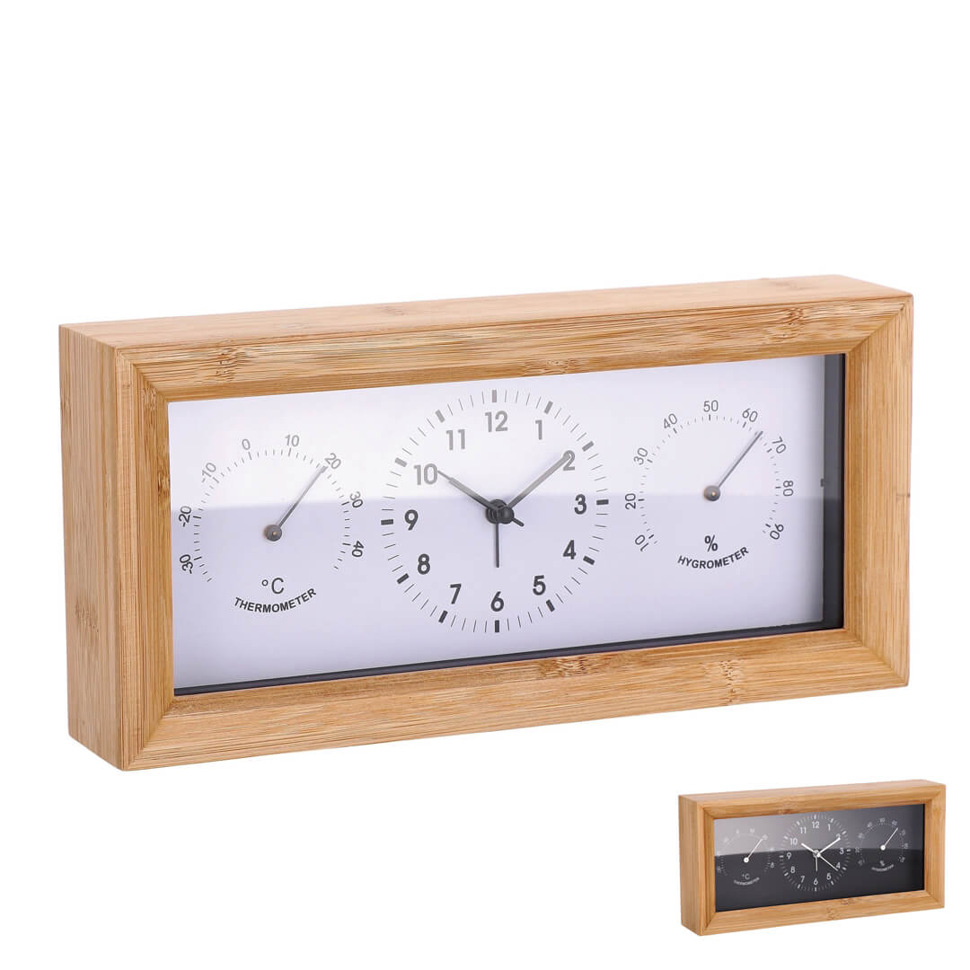 Pravokotna namizna ura združuje eleganco naravnega videza in praktično funkcionalnost. Njeno ohišje je izdelano iz trpežnega bambusovega lesa, ki v prostor vnese toplino in pridih narave. Poleg klasičnega prikaza časa z jasnimi arabskimi številkami – na voljo v beli ali črni barvi ozadja številčnice – ura vključuje tudi integriran termometer in higrometer, ki omogočata stalno spremljanje temperature in vlage v prostoru. Idealna je za dnevne sobe, pisarne ali spalnice, kjer si želite pregledno in stilsko dopolnilo s funkcionalnim značajem. Deluje na baterijo 1 x AA 1,5 V, ki ni priložena.