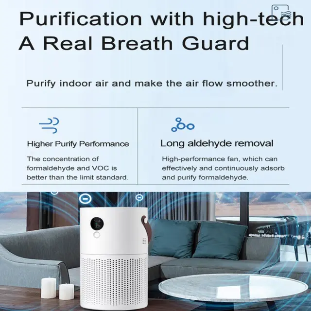 Ideal for Sensitive Users: Naš namizni čistilec zraka, zasnovan posebej za posameznike z občutljivostmi, zagotavlja olajšanje pred alergeni, onesnaževali in dražilnimi snovmi. Njegov napredni filtrirni sistem učinkovito odstranjuje prah, cvetni prah, prhljaj hišnih ljubljenčkov in druge delce v zraku, ki lahko sprožijo alergijske reakcije. Tehnologija negativnih ionov dodatno izboljša kakovost zraka z nevtralizacijo škodljivih snovi in spodbujanjem bolj zdravega dihalnega okolja. Popoln za ljudi z alergijami, lastnike hišnih ljubljenčkov in tiste z respiratornimi občutljivostmi, ta čistilec zraka pomaga ustvariti čistejši, udobnejši in bolj zdrav življenjski prostor. Lažje dihajte in uživajte v višji kakovosti življenja z našo specializirano rešitvijo za čiščenje zraka.