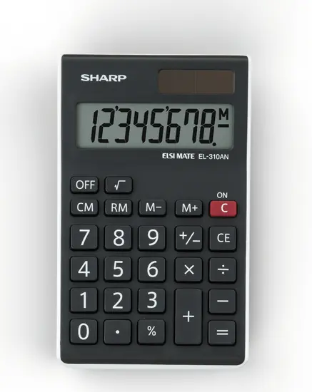 Komercialni kalkulator SHARP ima velik, rahlo dvignjen 8-mestni zaslon za boljšo vidljivost. Funkcije za koren, % , spomin. Ob daljši neuporabi se kalkulator sam izklopi. Baterija: LR54 (LR1130).