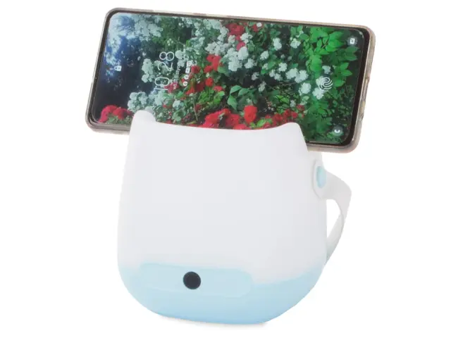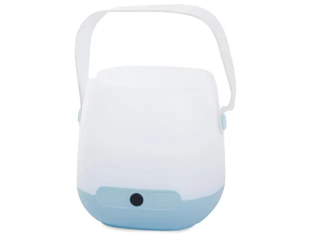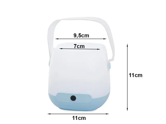 Material: plastika Dva svetlobna načina Večnamensko Stikalo za VKLOP / IZKLOP Napajanje: 3 x AA (ni priloženo) Ročaj za prenašanje Širina podnožja: 11 cm Širina na vrhu: 9,5 cm Širina luknje: 7 cm Višina svetilke: 11 cm Barva naključna